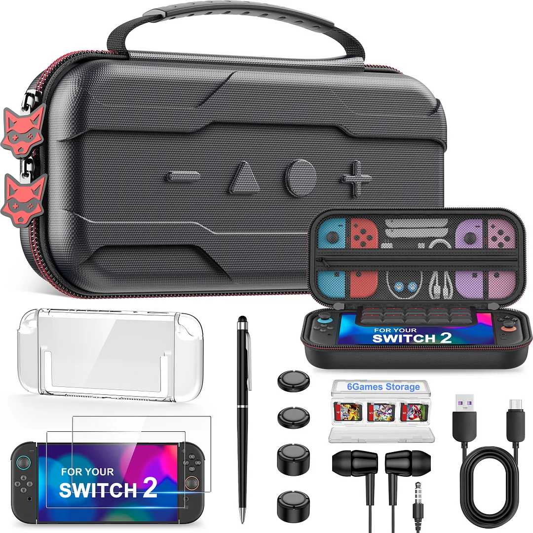 【Complete Packaging Inclusion】:1× Switch Carry Case,1*Transparent PC Split-Case,2* HD Tempered Glass Screens. 2*Pairs of Adjustable D-Pad Caps ,1*Foldable 6-Slot Cartridge Holder,1*1m USB-C Data Cable,1*Dual-Function Pen,3.5mm Audio Jack Adapter/Headset(Enhance immersion with crystal-clear audio for gaming or streaming)