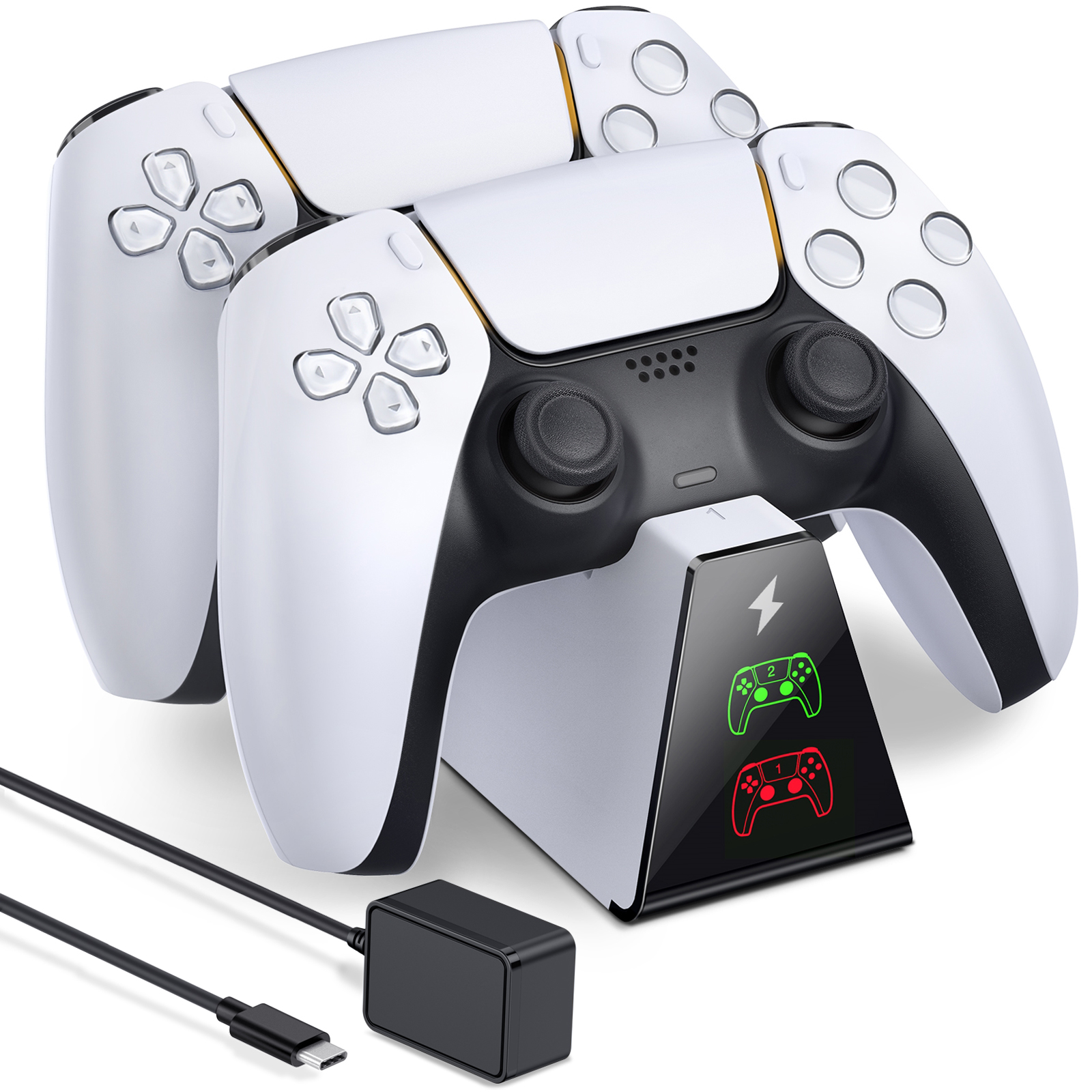 Green light - Full charged, Red light - Charging, the led indicator lights of PS5 controller charger show each controller's charging status. The Playstation 5 charger lay on securely and have non-slip gasket on the bottom to keep it from sliding off of a table or whatever it sits on