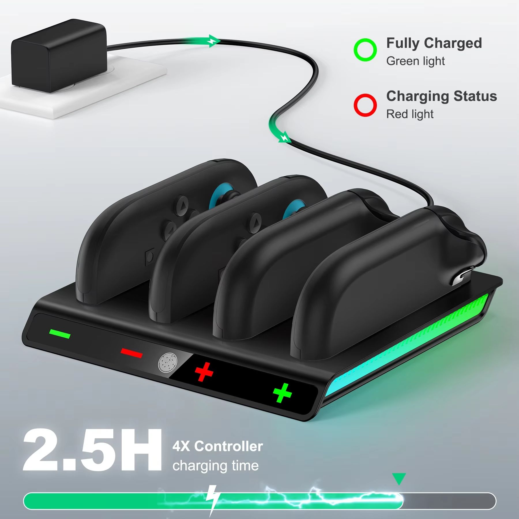 When the controller is completely out of battery, the charging time is about 2.5 hours. The charging time for charging one controller is basically the same as charging four controllers at the same time.