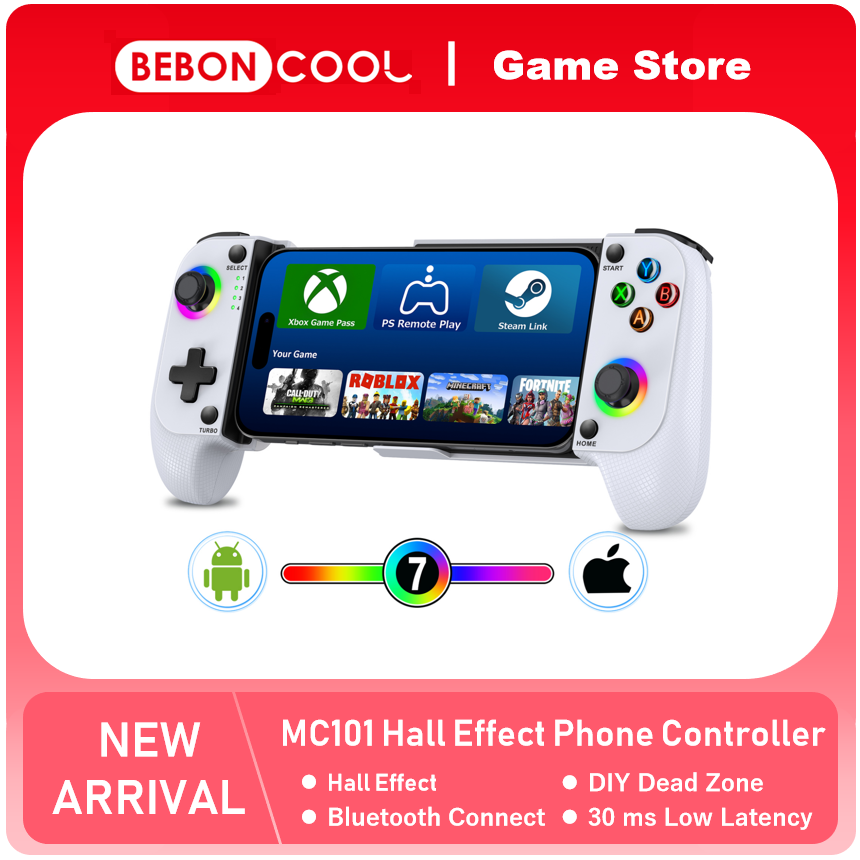Bluetooth controller BEBONCOOL MC100, using Hall stick 3D, RGB light effect display, the main function is used for Android platform /IOS platform mobile game controller. Support XBOX cloud platform, console streaming gameplay. Supports shanwan controller, gamepad space, and shootingplus v3+ APP.