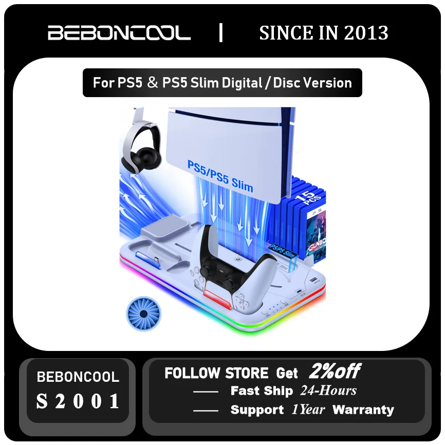 ❄️【Compact Cooling Stand for All PS5 Accessories】If you needed a multifunctional stand that would saves space and hold all ps5 accessories , the ps5 cooling system is the one for you. This ps5 stand with turbo cooling fan and dual controller charging station to fit any compact desk size, along with headset holder and console compatibility panels. Extra USB port for charging other devices and a removable 15 game slots to save desktop space when you don't need it.