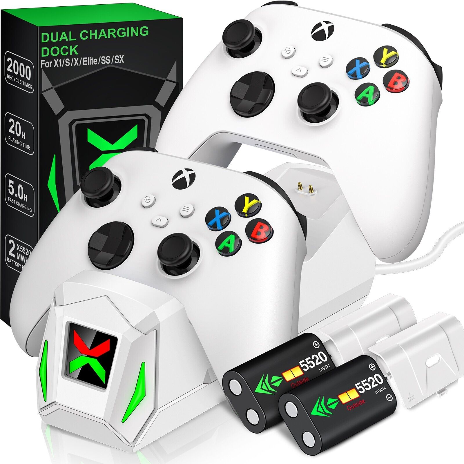 2 MAX 5520mWh Battery Pack for Xbox Controller: Package including 2x5520mWh Xbox one controller battery pack, the rechargeable battery pack for Xbox one controller provides you 18-25hrs long playing time but only needs 4-5hrs charging time. With two battery slots and upgraded battery capacity to extend your gaming time, and never miss a second of gaming (please note the batteries on the bottom of dock)