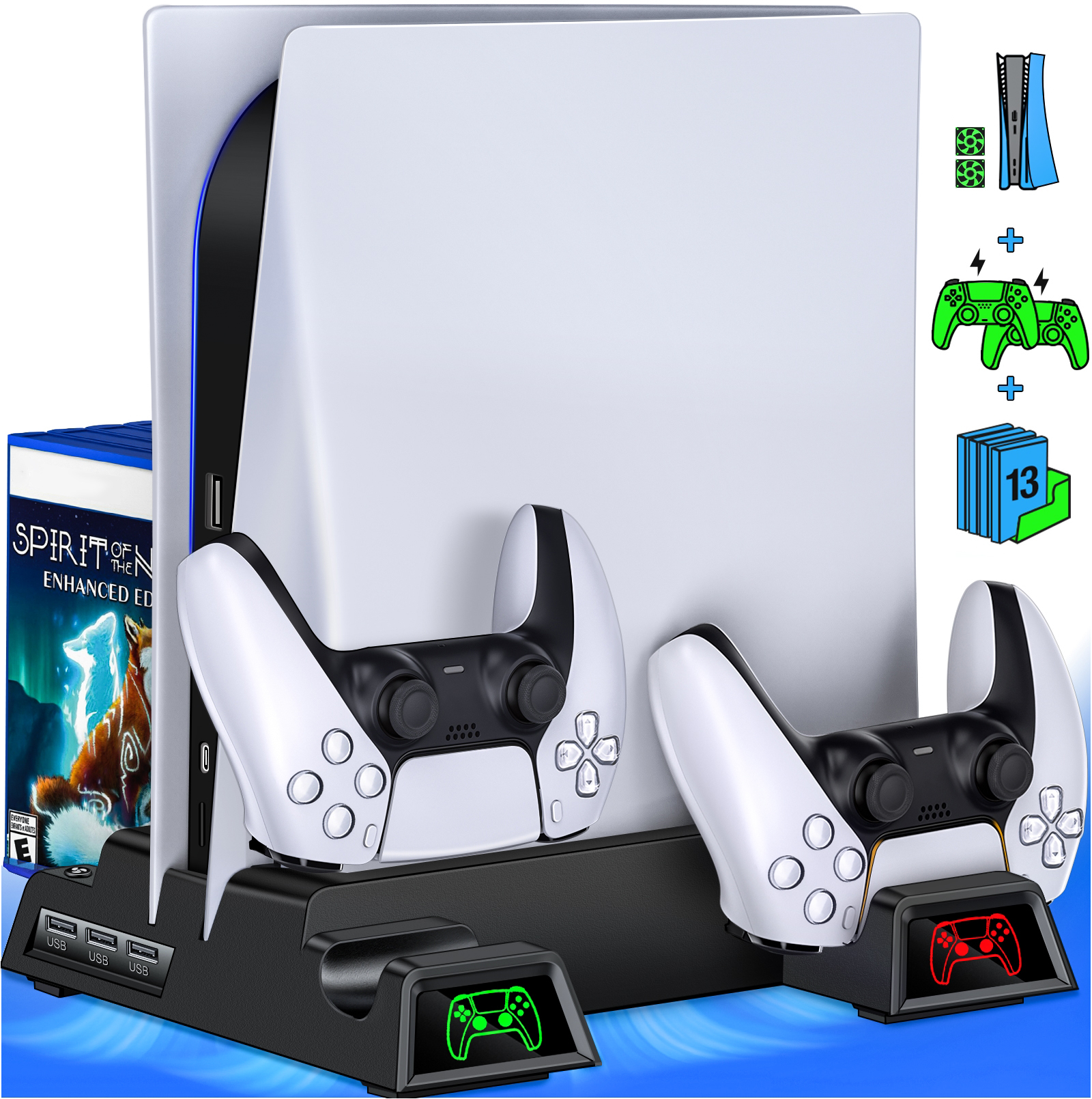 Multifunctional PS5 cooling stand fits well with your ps5 Digital Edition and ps5 UHD Edition Console.PS5 stand with 2 cooling fanscan effectively reduce the temperature of the ps5 console, and the cooling fans are very quiet and not affect your rest. It will not overheat even if play games for a long time, which protects the service life of ps5 console, and keep your ps5 console and ps5 controllers organized.