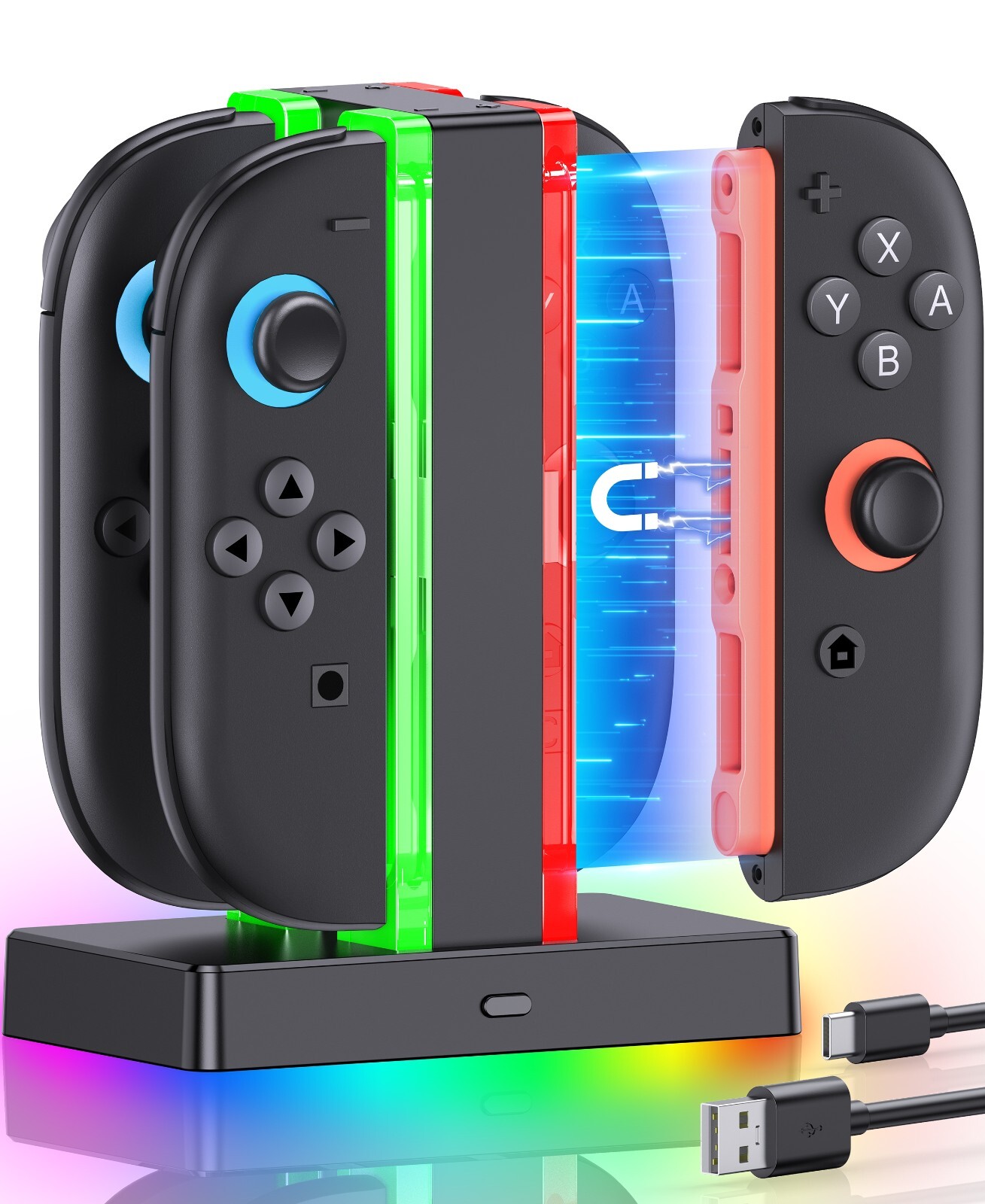 [Clear Dual Color LED Indicator & Multiple Charging Protections] The charger compatible with joycon 2 features clear dual color LED indicator lights, with red indicating charging in progress and green indicating charging completed,the acrylic material lamp post has a crystal like effect. The switch 2 remote charger stand adopts the most advanced technology, and the intelligent chip ensures the safety of charging the battery overnight, with overcharge / overvoltage / overcurrent / overheating / short circuit protection