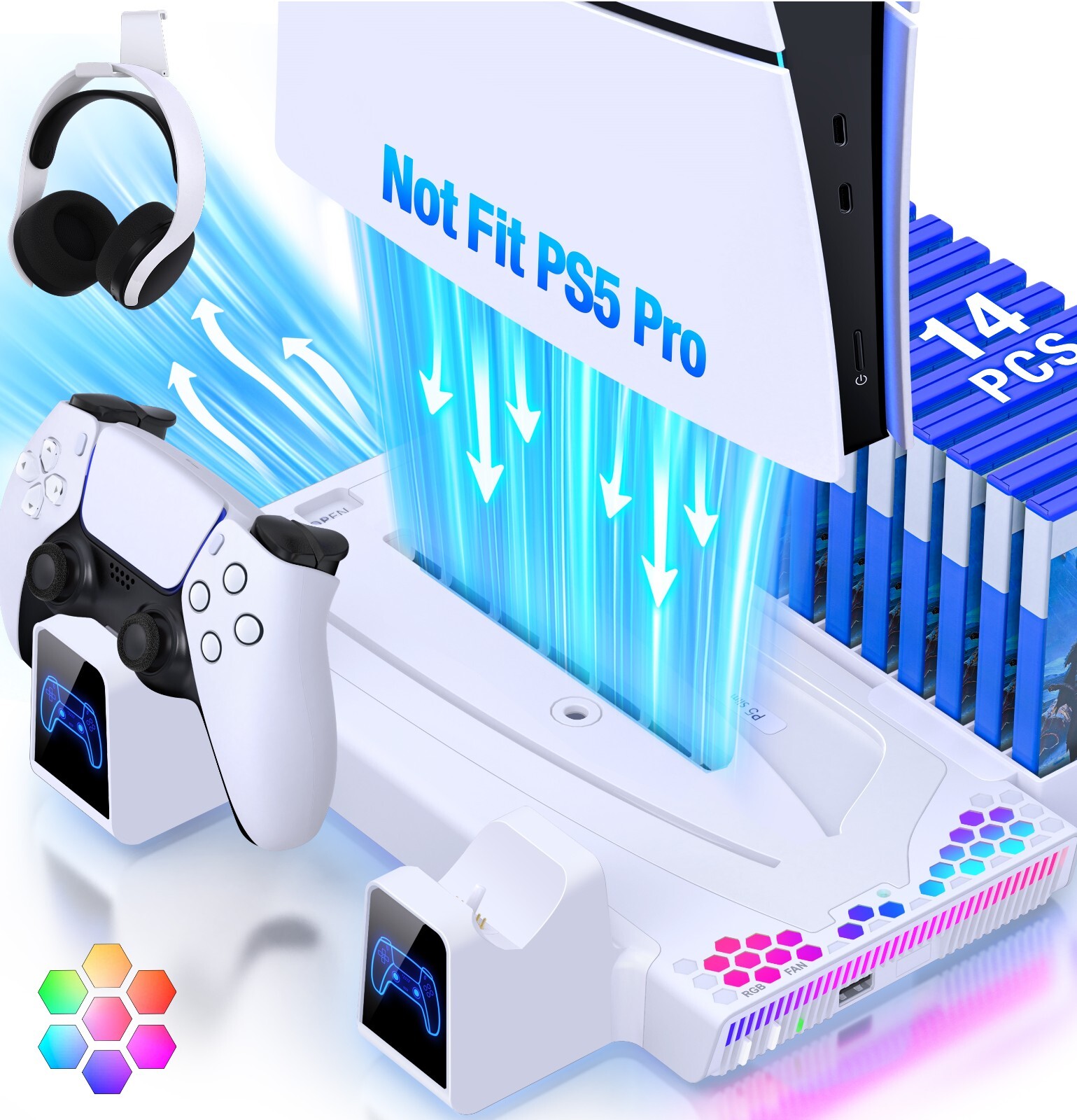 Enhanced Storage Solutions: This PS5 cooling station features a dedicated slot for up to 14 game discs and a hook for hanging your headset. The base also includes a fixed screw for added stability, helping to keep your gaming area organized and clutter-free.