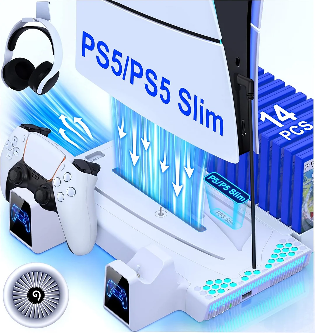 PS5 Slim Stand and Cooling Station with Controller Charging Station for Playsation 5, PS5 Accessories Incl. 3 Levels Turbo Fan, 14 Game Slots, Headset Holder, PS5 Cooler for PS5 Digital/Disc
