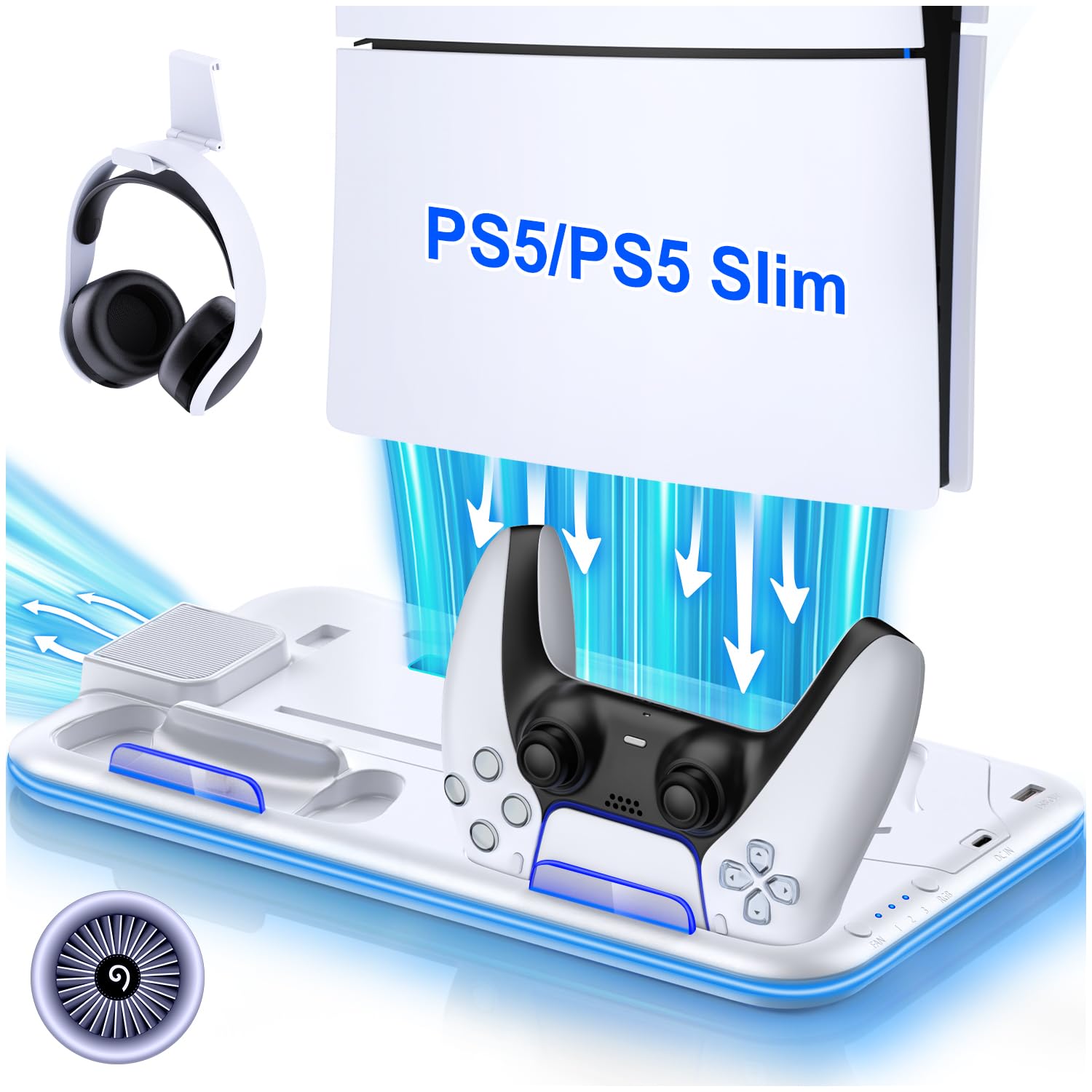 PS5 Stand, PS5 Cooling Station with Controller Charging Station for PS5/PS5 Slim Disc Digital Console, PS5/PS5 Slim Accessories-Cooling Fan, Headset Holder, 15 Game Slot for Playstation 5, White