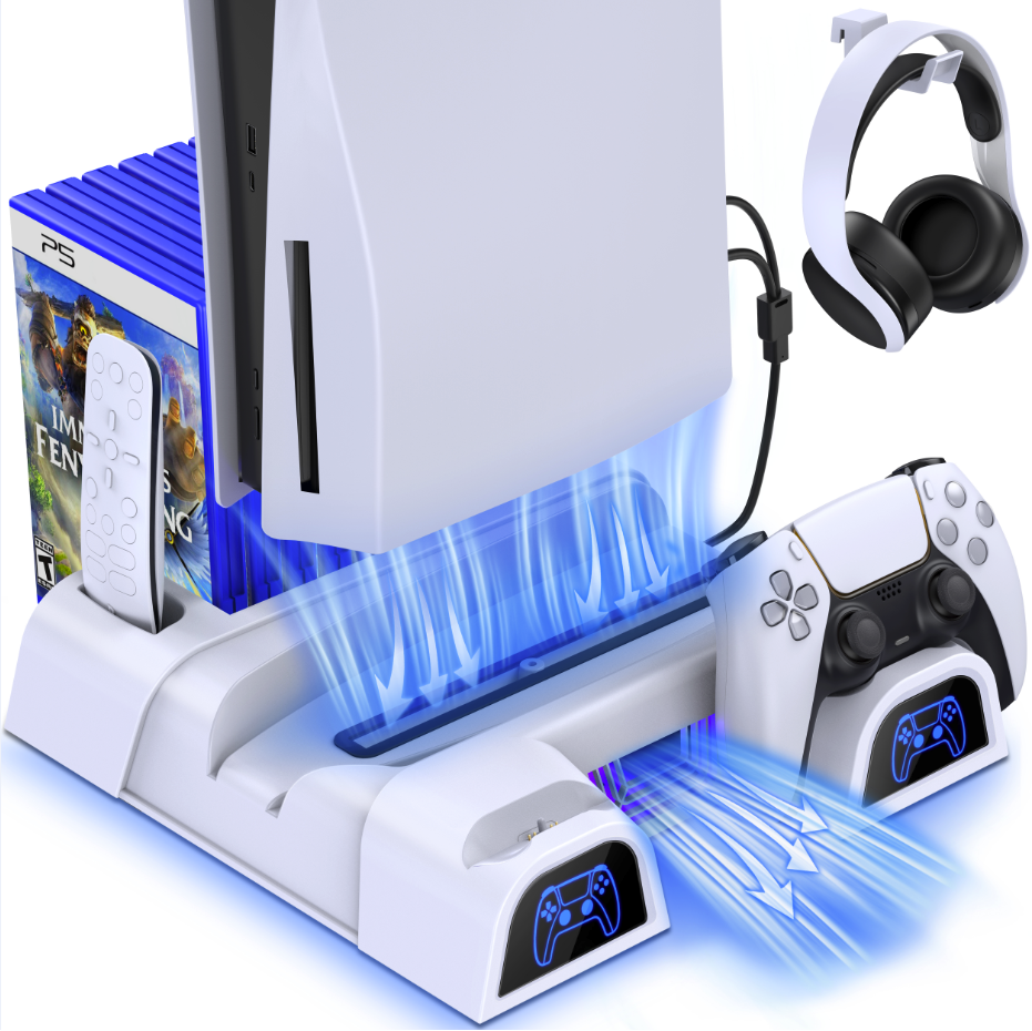 PS5 Stand with Cooling Fan and Dual Controller Charger Station for PS5 Console Playstation 5,PS5 Vertical Stand with 10 Game Slots, 1 Headset Holder, 1 Media Remote Storage,White